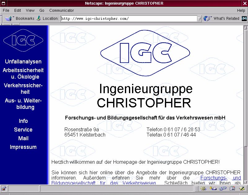 Unter der Domain http://www.igc-christopher.com finden Sie Informationen der Ingenieurgruppe CHRISTOPHER. Das Design und die HTML-Umsetzung stammen von uns.
